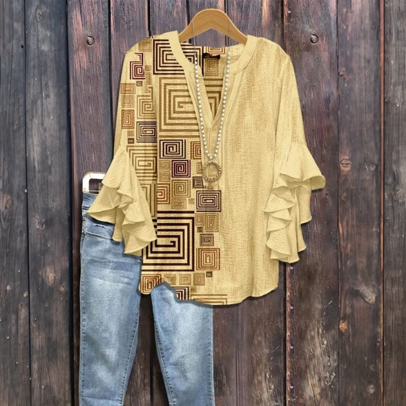 Vintage Blus Med Geometriskt Tryck